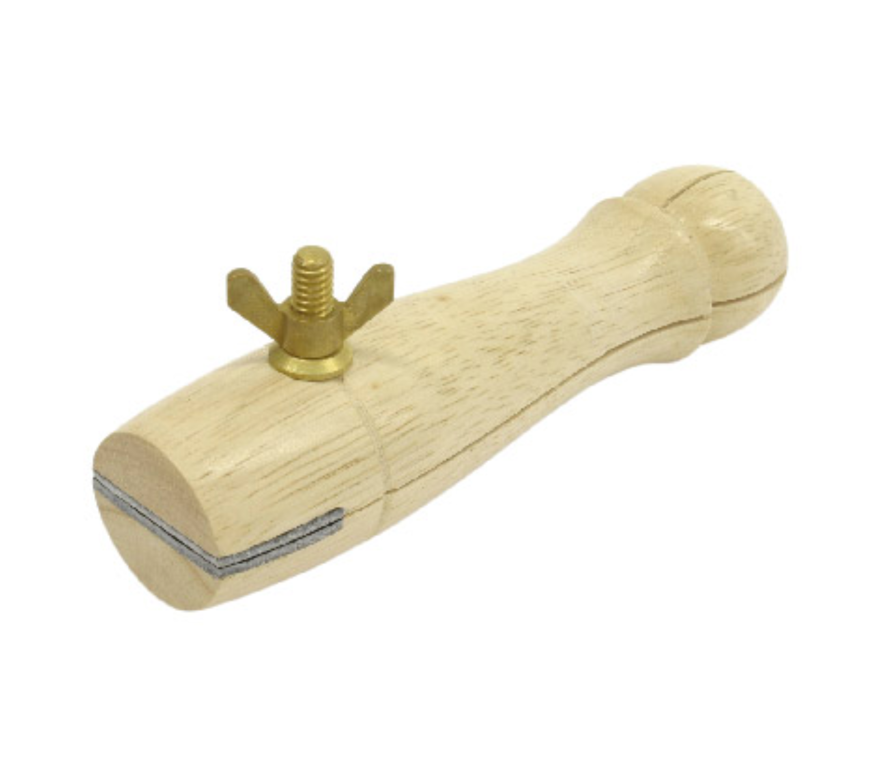 Designed to secure rings during intricate tasks like stone setting, this clamp is a cornerstone for precision work. Crafted from durable wood, the clamp delicately holds the ring between two protective leather pads, safeguarding against scratches. Easily adjustable with a quick turn of the wing nut on the side, this tool offers both stability and flexibility for your meticulous crafting needs.