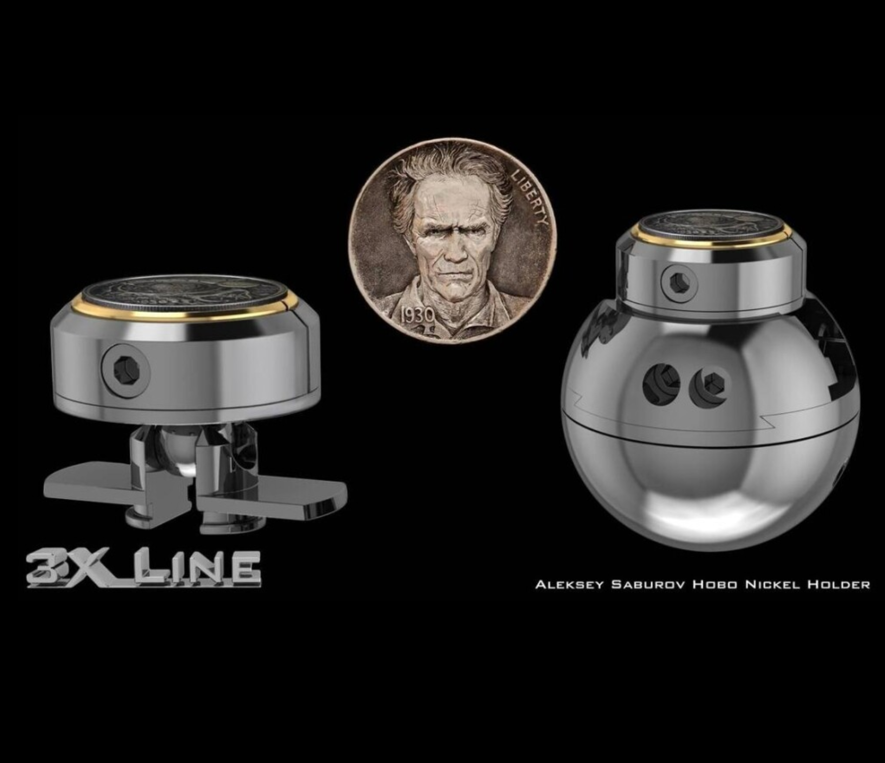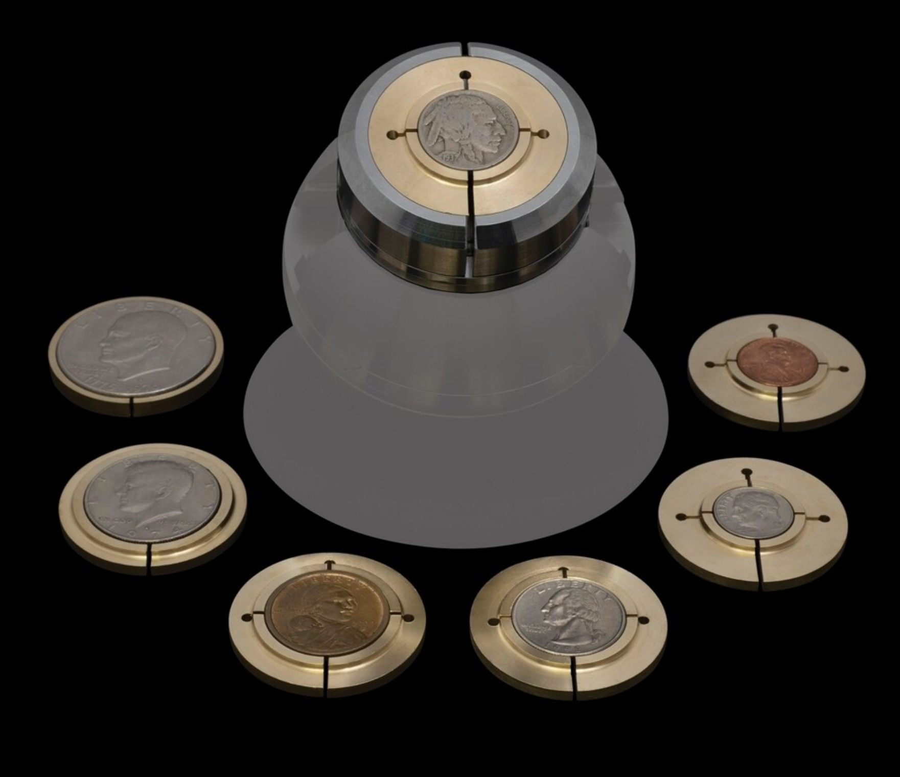 The Hobo Nickel Holder uses a unique brass collet system that has been designed specifically for the most popular coins artists work with. The outer portion of the vice provides a sturdy clamping system to reduce vibration. Includes collets for Penny, Dime, Nickel, Quarter, Dollar, Half Dollar, Eisenhower Dollar. Coins not included. Use this clamp on any (None JURA) Vise with help of Aluminium Adaptorblock!