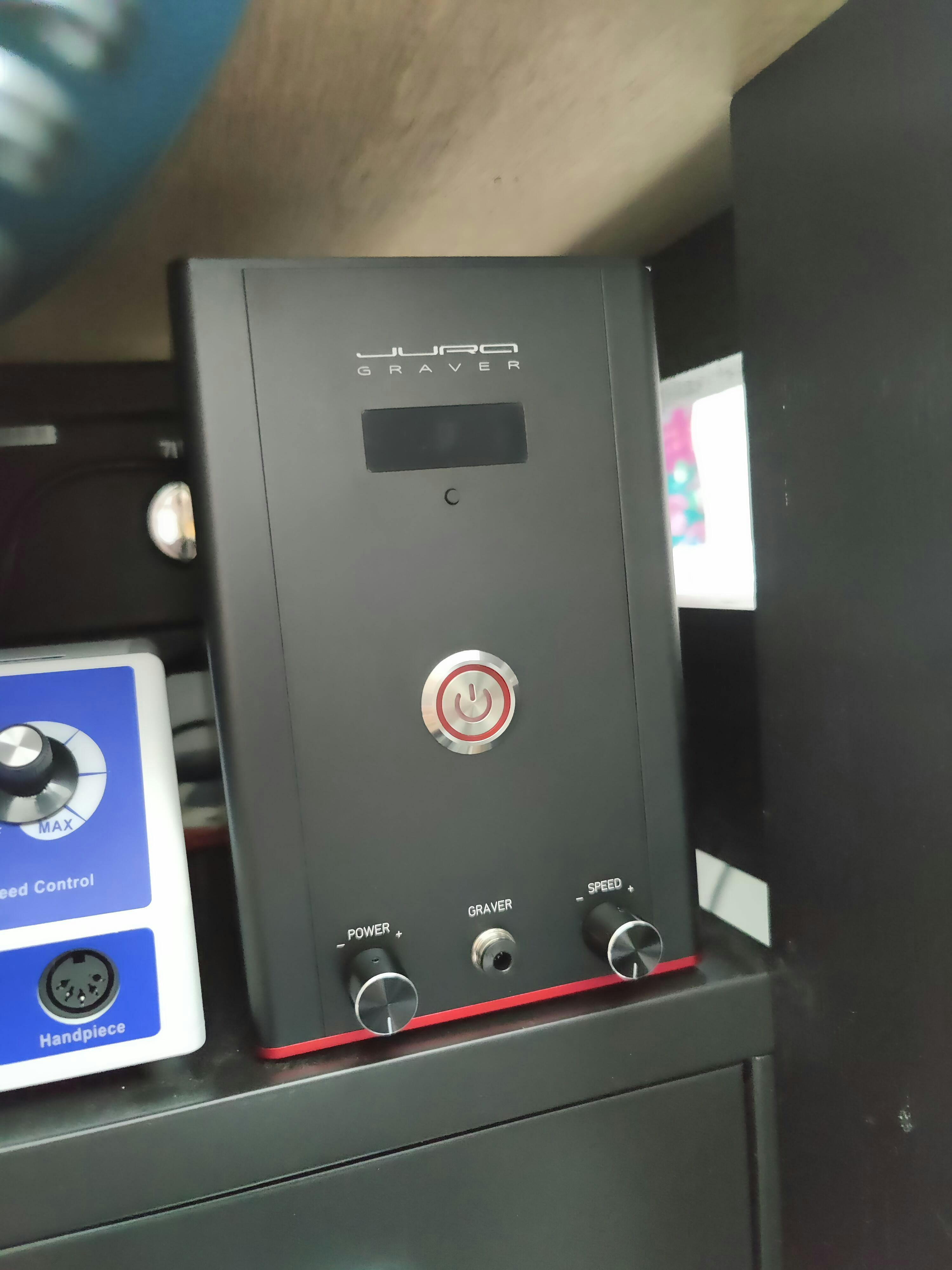 The innovative JURA Graver Only System harnesses advanced technology to provide smooth, powerful and precise engraving without the need for a bulky compressor. Ideal for any professional looking to elevate their skills and work more efficient. This powerful system ensures a seamless operation across a variety of materials from gold to stainless steel. The ergonomic handpiece is also suitable for hammering and filing tasks. Your investment in the Next level of precision! New stock will come with the Next generation engraving handpiece OR with GRS Quick changes compatible handpiece... the set of JURA quick changes that will standard come with this handpiece are 2,35mm.