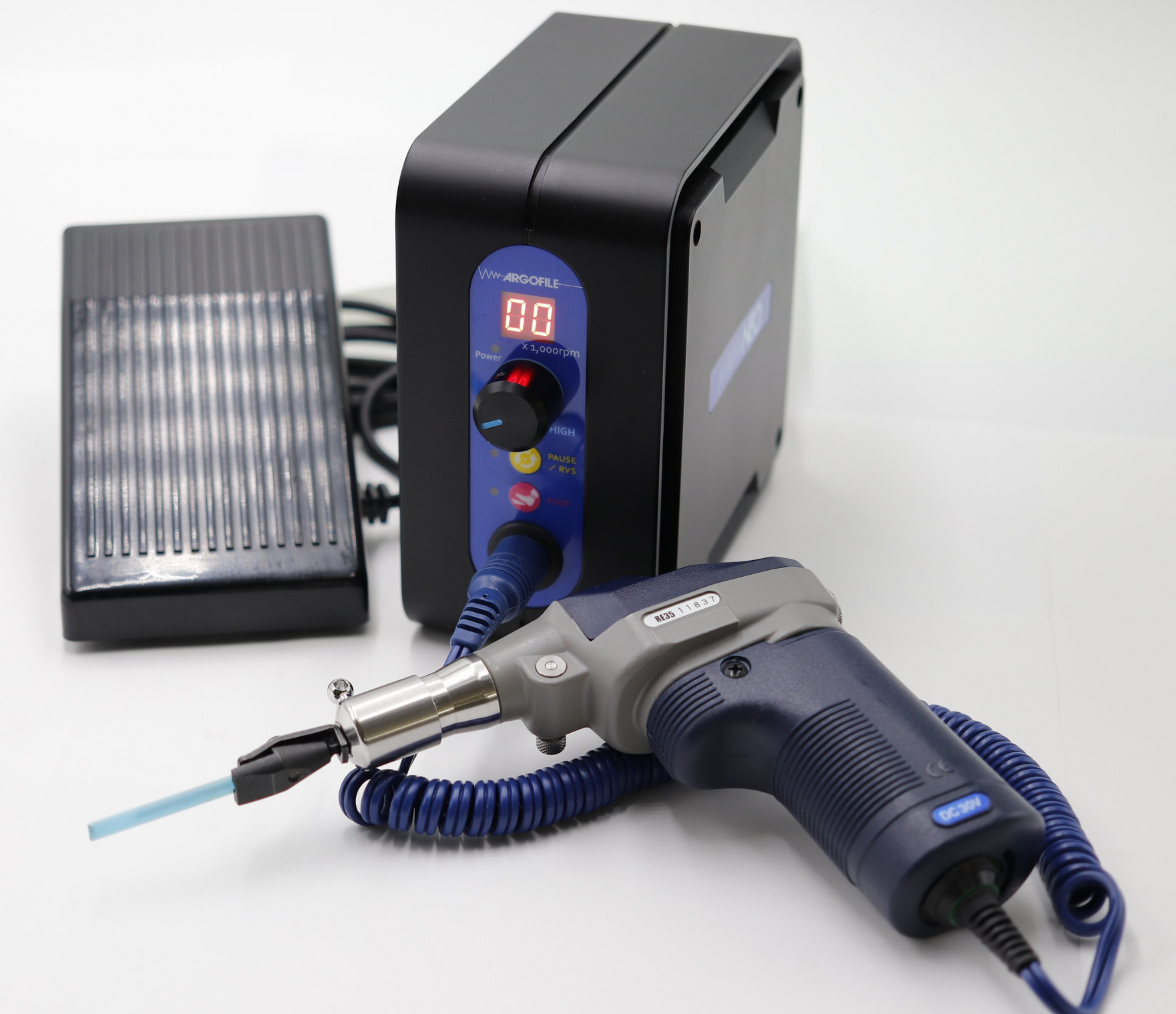 RE55: Offering multiple combinations of stroke length between 0 and 2mm and stroke speeds between 700 and 7000 strokes per minute to optimise usage with ceramic stones or mini files.